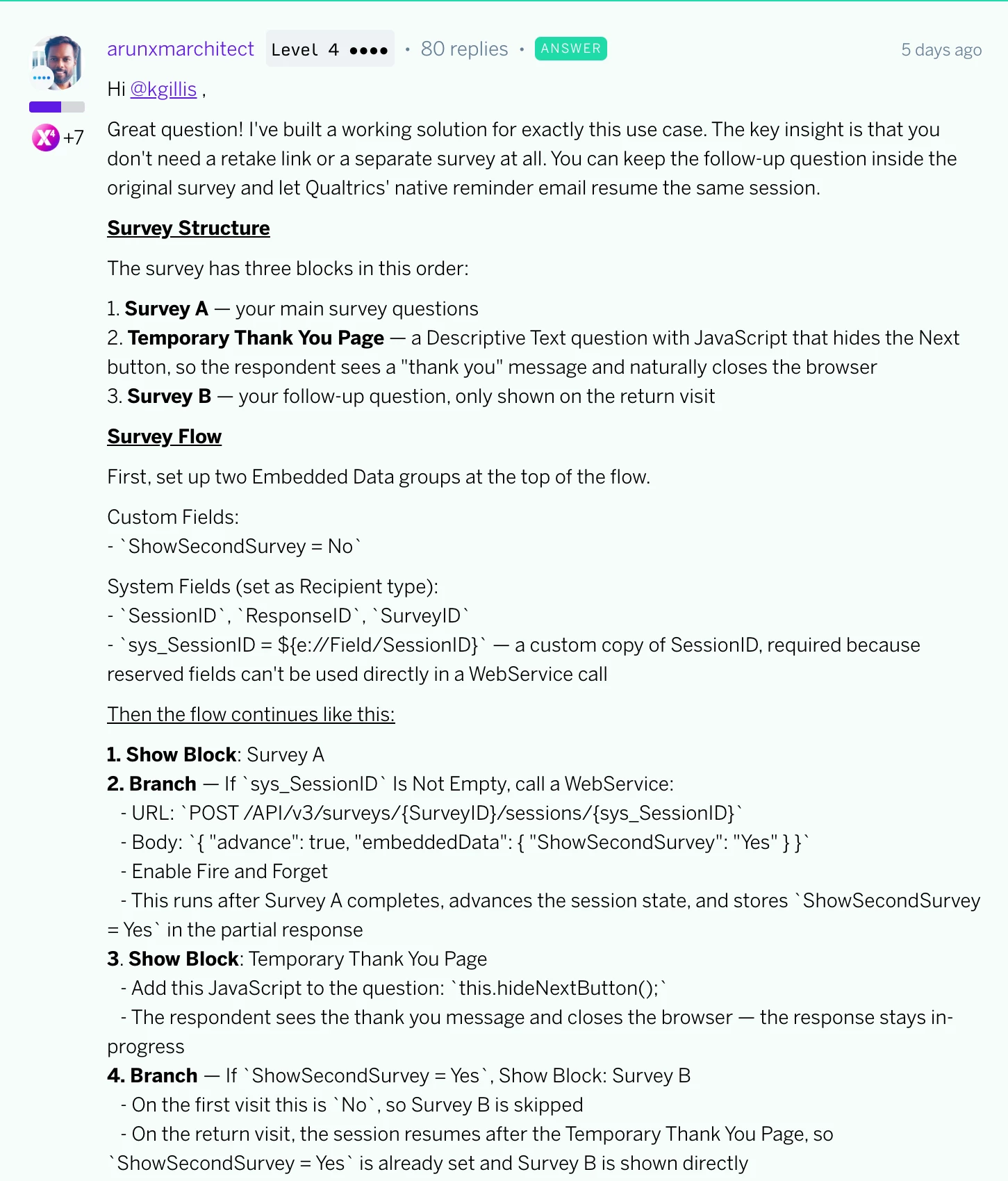 This week, discover the top survey design and organizational buy-in tips from our X4 Badge of the Month challenge, learn JavaScript solutions for audio-only response validation, and explore workarounds for displaying branch names instead of coordinates in map widgets.