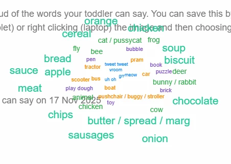 That looks absolutely perfect - I’m going to have quite a few more words that might potentially go into the word cloud (as the parent can select out of over 500 words their child might know) so I may try and randomly choose a few words they know, out of each category.