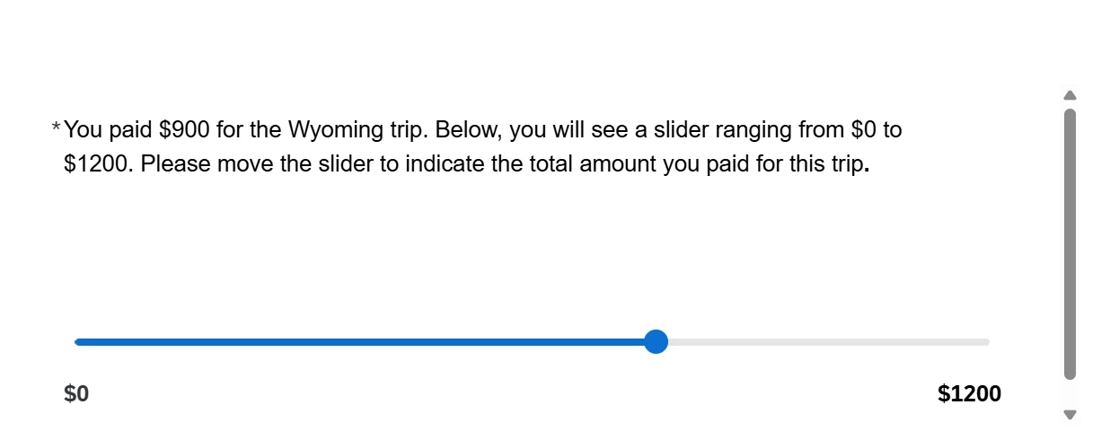 I’m running an online study using a Qualtrics survey that includes a slider question ranging from $0 to $1200. Participants are asked to indicate a specific dollar amount by adjusting the slider.