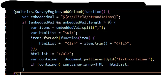 I’m working on a follow-up survey question where I want to display embedded data (strand1q1nos) as a bulleted list. This embedded data comes from a side-by-side question earlier in my survey. Specifically, the piped text ${e://Field/strand1q1nos} contains a comma-separated list of all row labels corresponding to rows where the respondent selected "No" in column 1 of that side-by-side question.