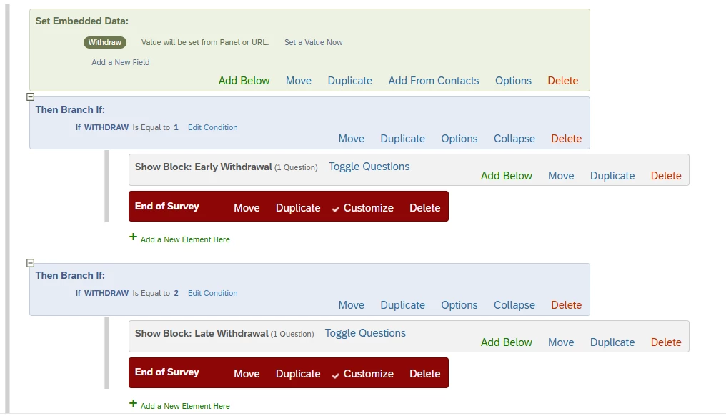 I have a survey with sensitive topics that I need participants to be able to withdraw from at any time, while still being redirected to a debrief page and then an “end of survey” element for compensation. As it stands, I have three separate debrief blocks (one for early withdrawal, one for late withdrawal, and one for completion). I also have three “end of survey” elements, with each one having its own redirection link so that participants may be compensated based on how much they completed.