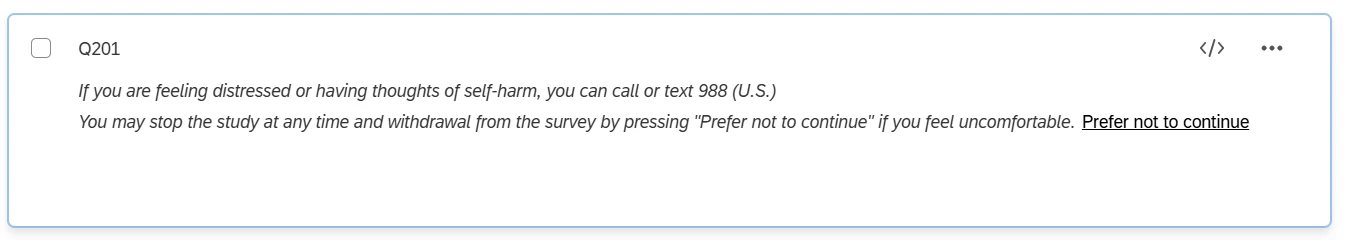 <span style="font-size:14px;"><i>If you are feeling distressed or having thoughts of self-harm, you can call or text 988 (U.S.)<br>You may stop the study at any time and withdrawal from the survey by pressing "Prefer not to continue" if you feel uncomfortable.</i></span>