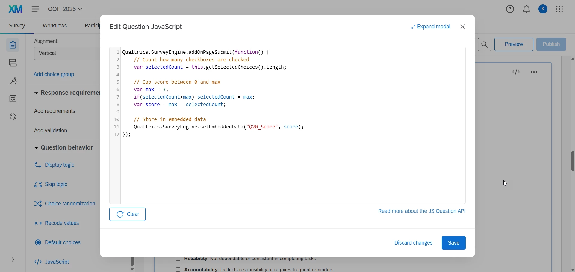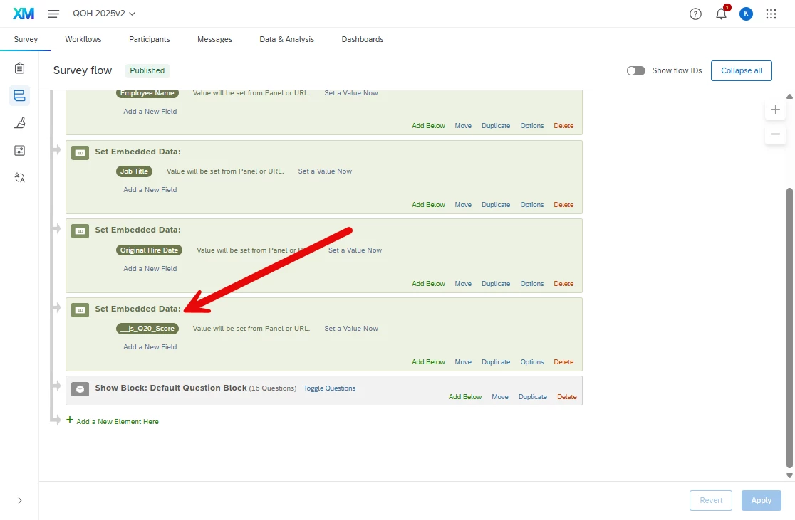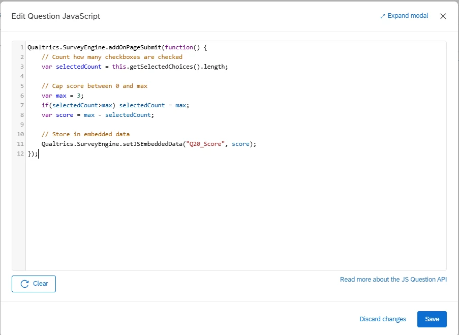 Qualtrics.SurveyEngine.setEmbeddedData("Q20_Score", score);