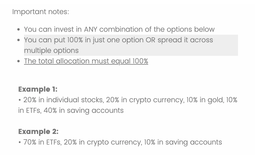 <li>You can put 100% in just one option OR spread it across multiple options</li>