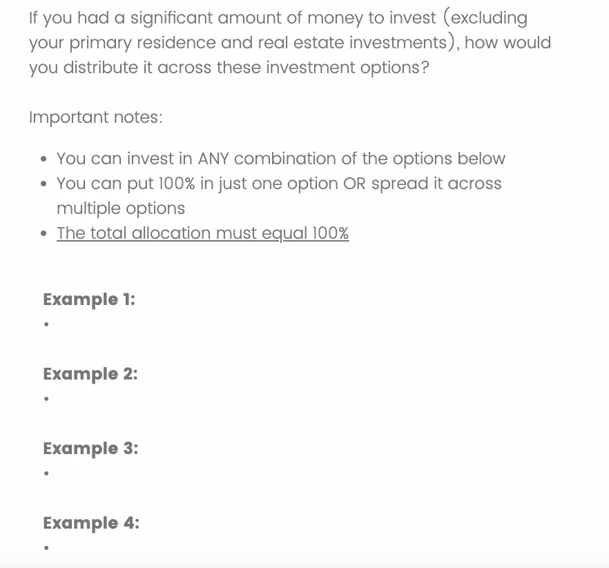 If you had a significant amount of money to invest (excluding your primary residence and real estate investments), how would you distribute it across these investment options?<br>