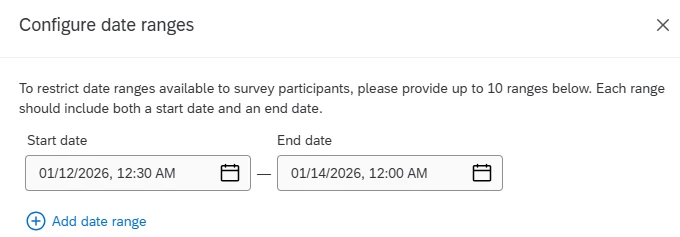 Then when setting the restriction, make sure to specify time slots that will include "12:15 AM" as a selectable time in the survey. So if you wanted to restrict 01/13/2026 from being selected, set the Start date as "01/12/2026 12:30 AM" (making 12:15 selectable) and the End date as "01/14/2026 12:00 AM" (making 12:15 selectable).