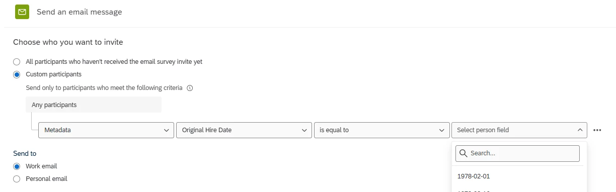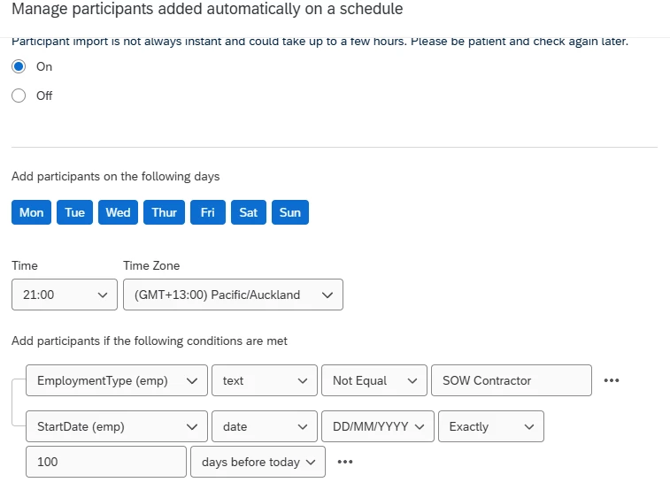 For the current onboarding survey we have, it’s sent 100 days after a person starts with the company (excluding a specific type of contractor), using the automated participant import criteria below.