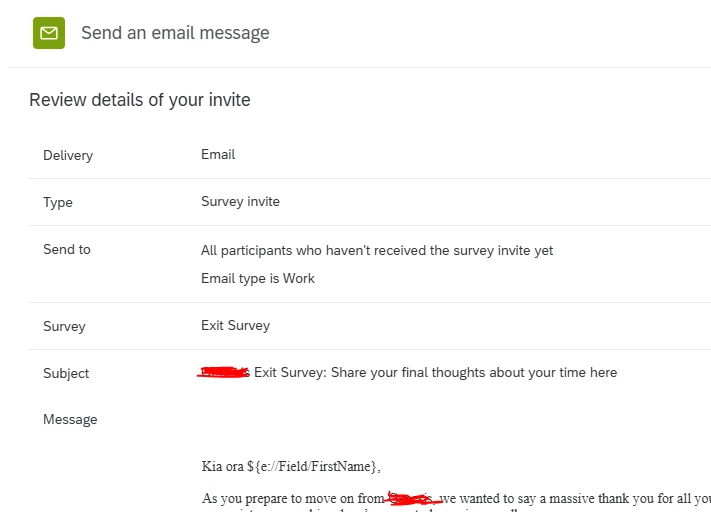 Thank you for responding to me, this is useful. Not sure what is the scope in SAP for the business scenario then, as it has a timing in the Intelligent Service centre -- to send the survey after X days of the event (Hire Date), but you are saying the survey is actually triggered from Qualtrics based on Survey Participants ? So from my understanding the Participants are added in Qualtrics based on the automation rule you sent above. This is working and I can see the metadata there. Then, do I also have to set up Messages Email in the Survey?