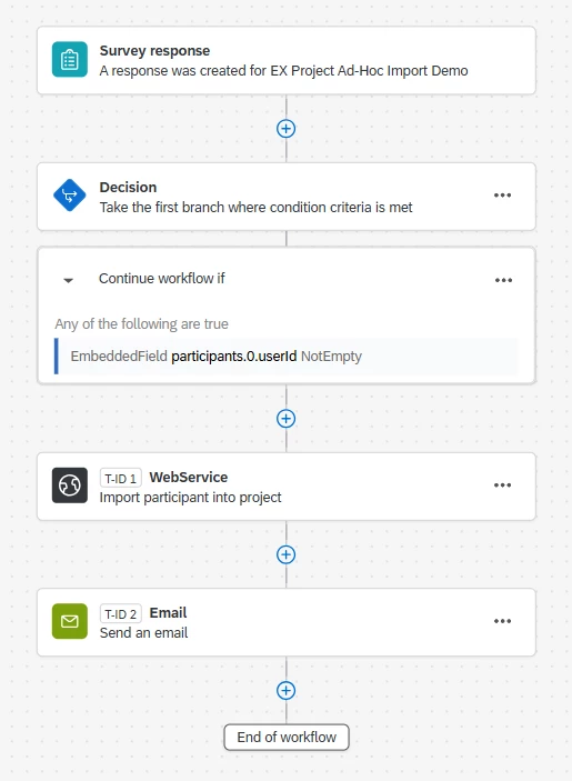 Add a decision/criteria to continue the workflow if embedded data “participants.0.userId” is not empty (so that the workflow only runs if the employee ID was valid).