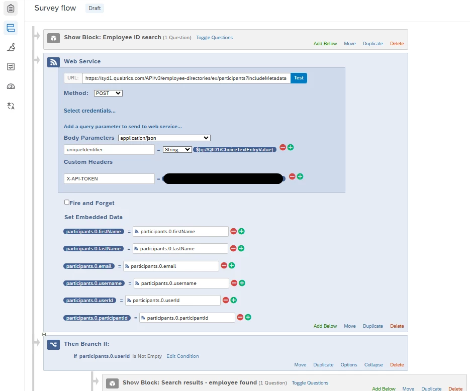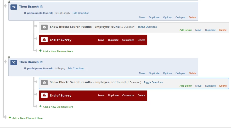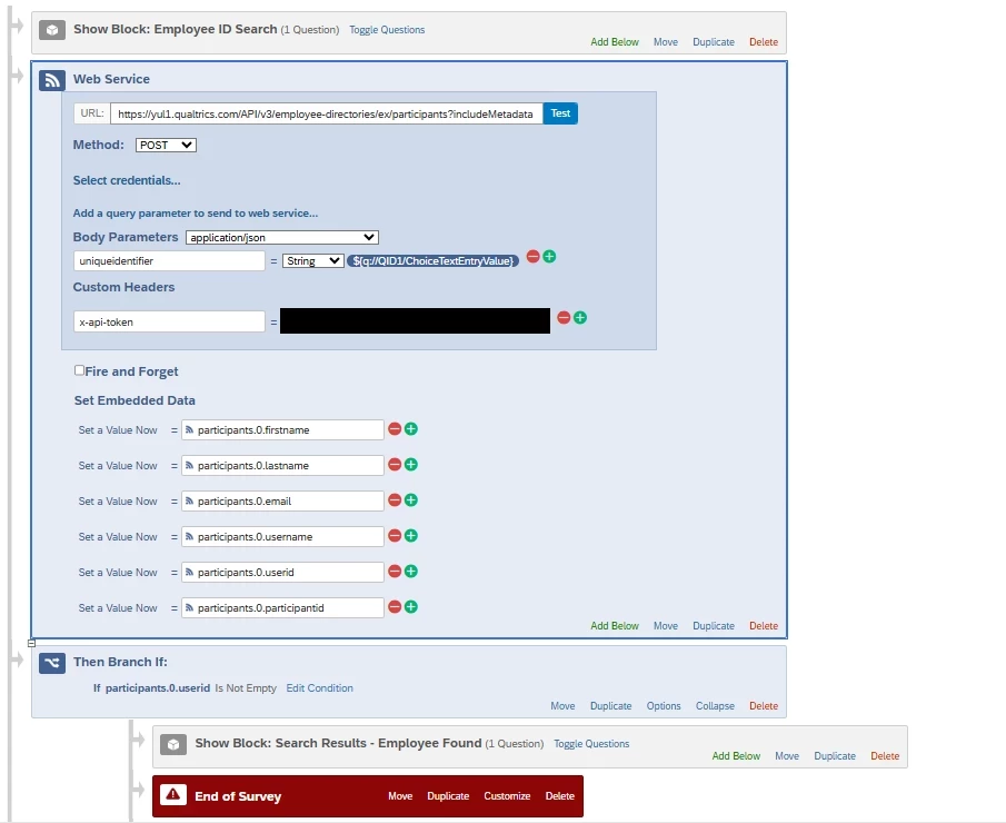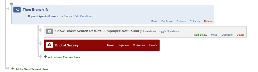 Add criteria to only run the branch if Embedded data field “participants.0.userId” is Not Empty (this means that the Employee ID was valid and found in the Directory).