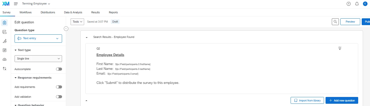 If a participant is found (which is defined by a user ID being returned from the api call above), then display the name and email of the employee to the user. User can click submit to distribute survey.