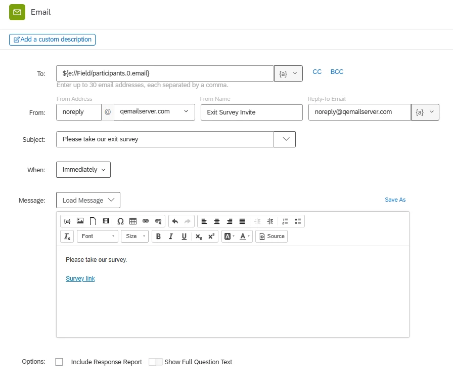 Then to actually import the participant into the exit survey project and distribute an email invite, you can run a workflow off of the survey to run this process.
