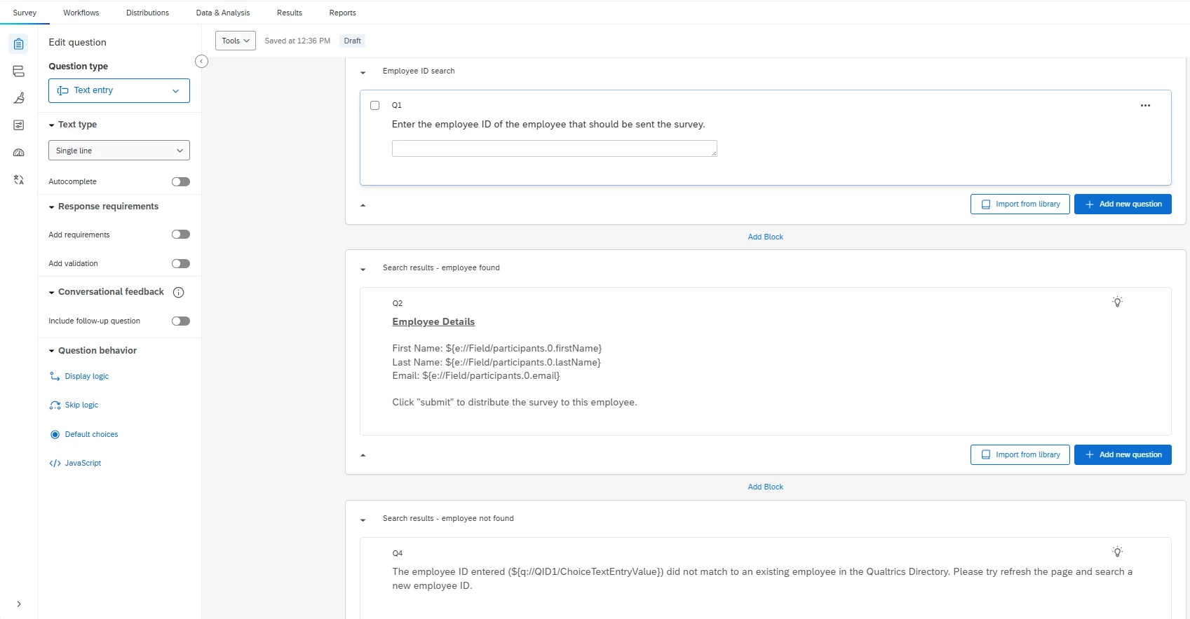 Create a 3rd question block with one text/graphic display question that shows the information to display if an invalid employee ID was entered.