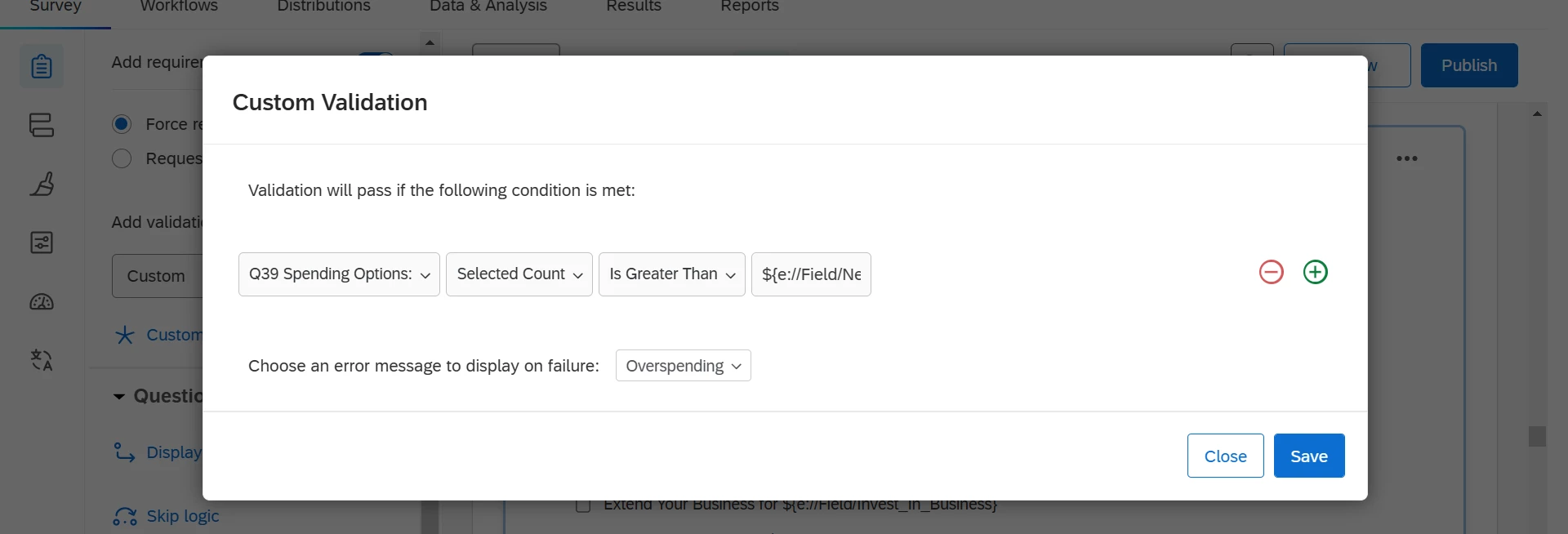 Hello, I want to create a study on qualtrics. Participants have some income that they have earned before and they spend with this income. I want to prevent overspending by using Validation logic. But it does not work.