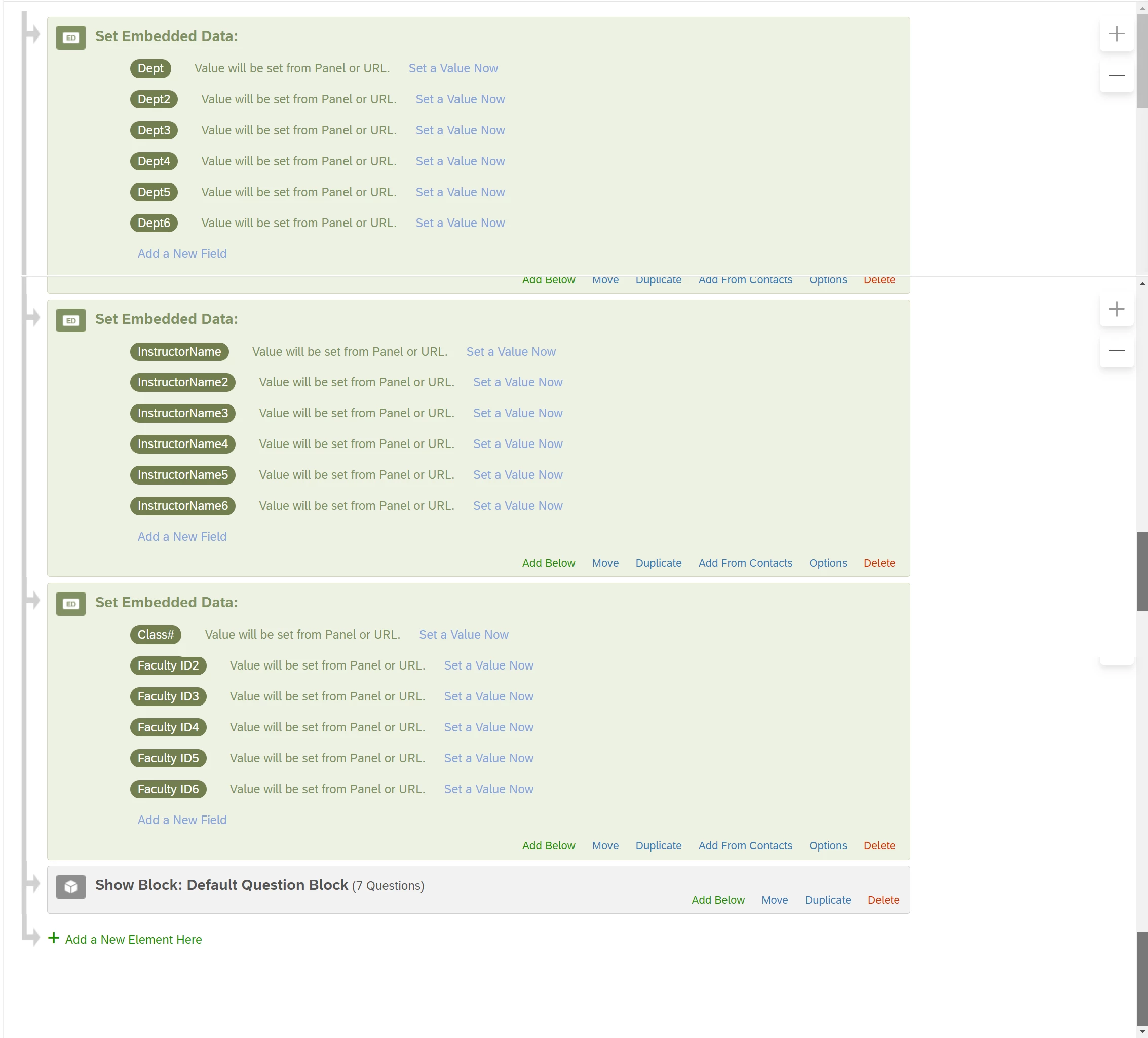I have tried setting up Embedded Data in the survey flow and added the information into a panel that part works but when I said that I have three classes so I added my name three times and put the course information into the panel.  I got the email invite and reminders correctly but the problem is that I cannot respond to the evaluations after I filled out the first evaluation.