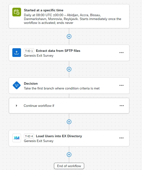 When implementing Qualtrics with SuccessFactors, our implementation partner (Davidson) suggested that based on our use cases, we use Workflows > Stand-alone workflows and have 1 file for leavers data (workflow as the starting object when building the file in SuccessFactors Integration Centre) and 1 file for employee data.