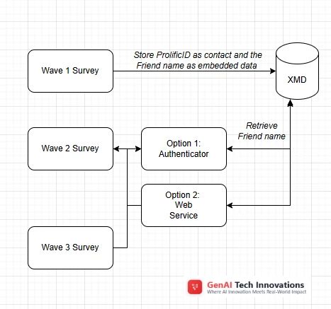 I am conducting a three wave study via Prolific, using Qualtrics. Participants will use an anonymous link to enter the survey. In the first wave, I automatically collect their ProlificID and they have to manually enter the name of a friend in a text field. In the second and third wave (with an interval of 3 days) I want to remind them of the name of the friend that they entered in the first wave based on their ProlificID.