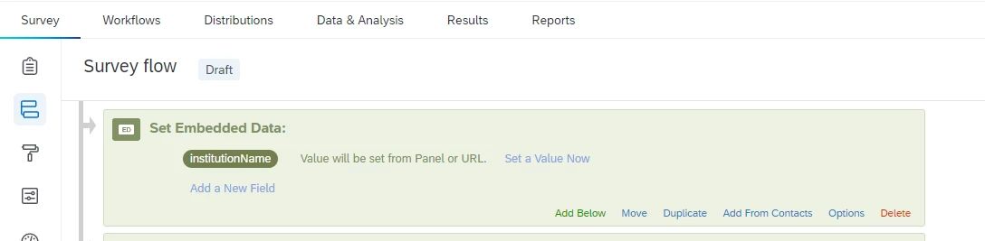 - Add a new embedded data field to your survey called institutionName. Leave the value blank, as this will allow it to populate dynamically based on what we do next.