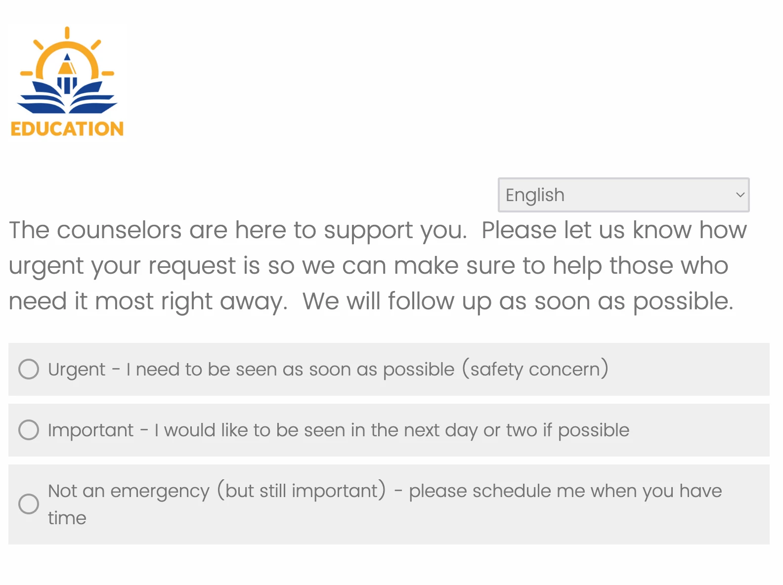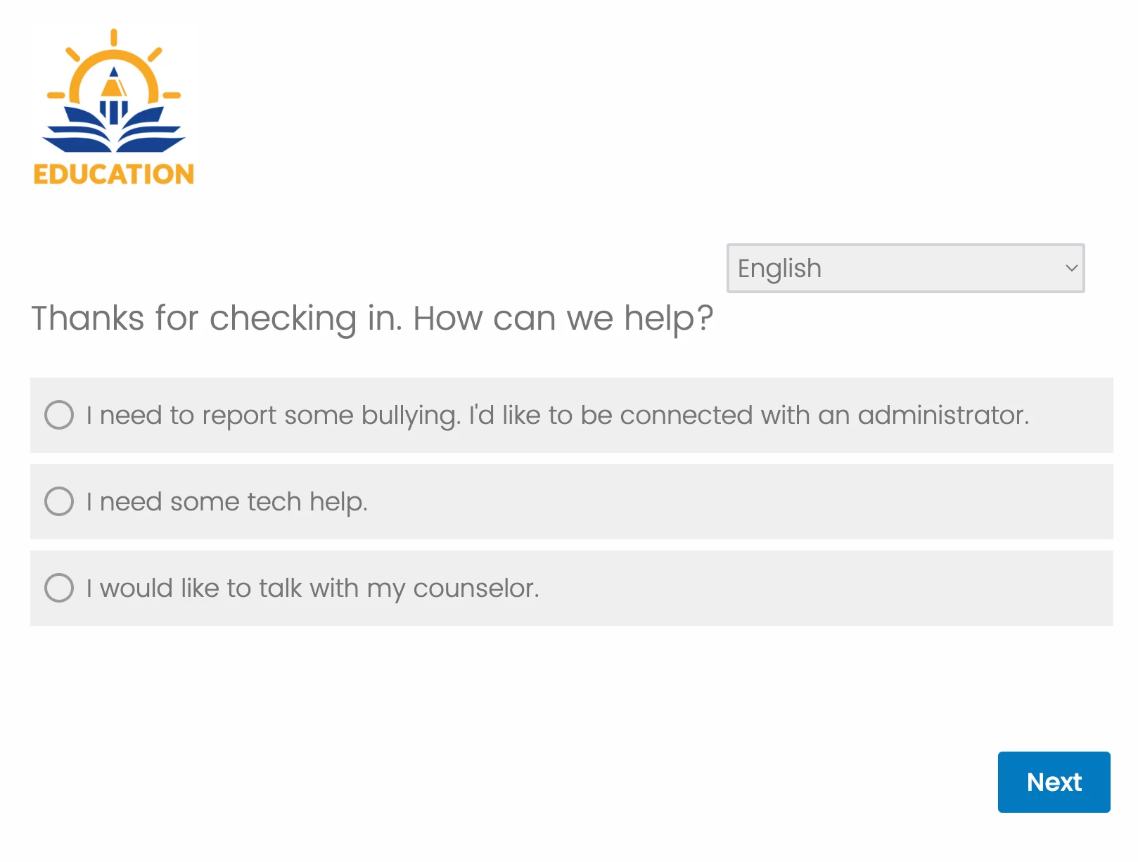 Download the attached file for a 14-question survey that can direct students to various resources depending on their needs ranging from reporting bullying to technology issues to scheduling time to meet with a counselor. We would also recommend routing these survey results to the appropriate party through workflows (Examples: Admin, Principals, Counselors, etc!).