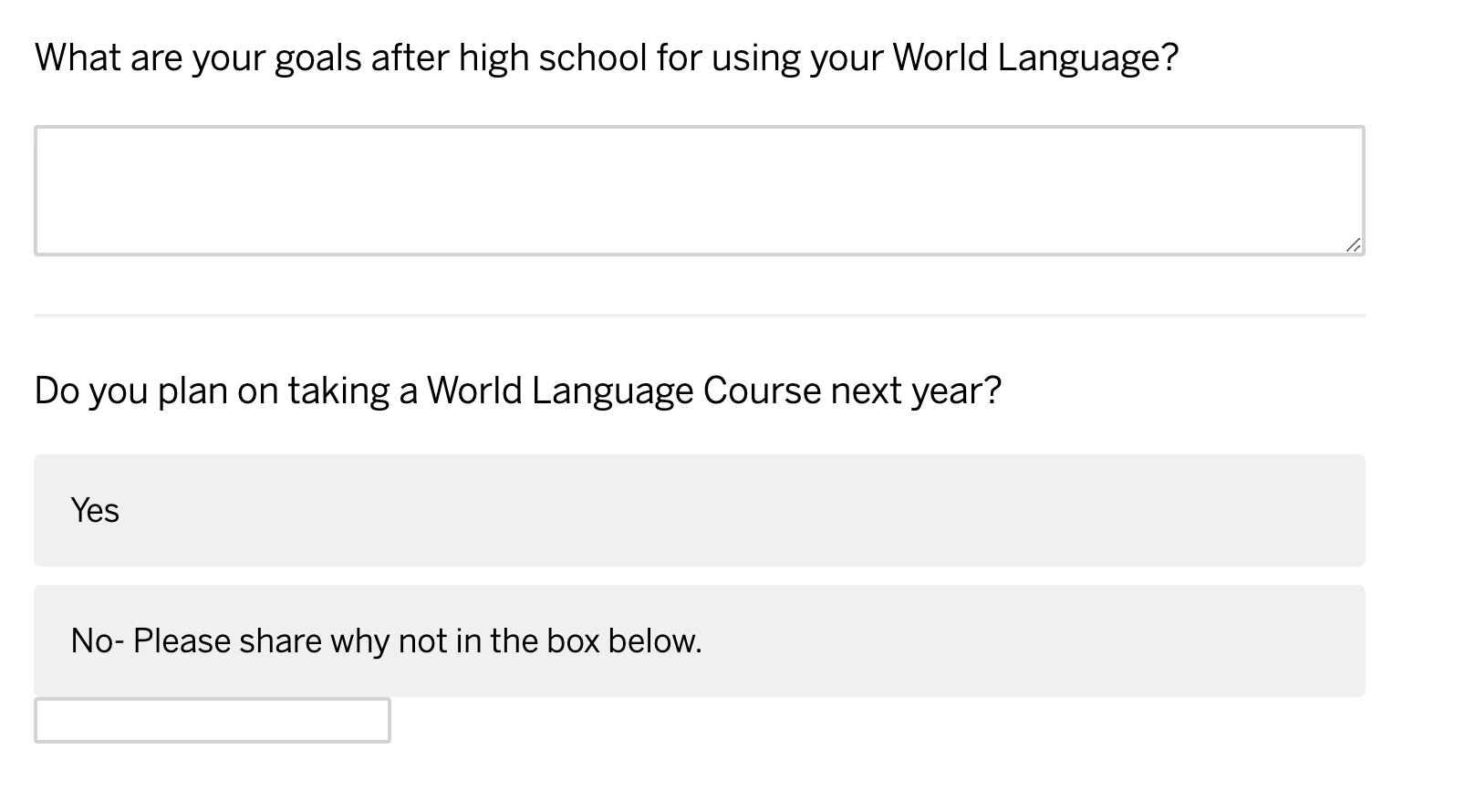 Over the years we have seen a decline in the number of students taking a world language course in high school. The survey was designed to collect information from high schoolers on if they were currently taking a world language course, if they planned to take one in the future, and if not, why.