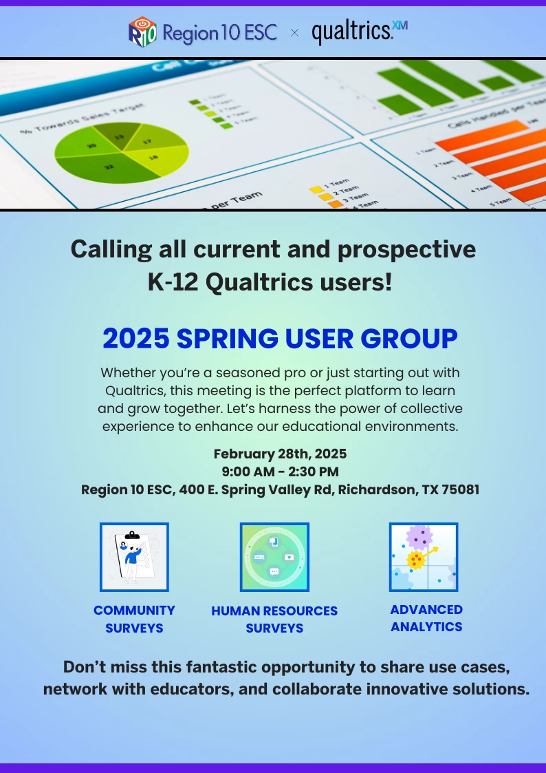 Are you in the Dallas area? Join Region 10 ESC for an exciting networking event to share your experiences, connect with fellow educators, and collaborate on innovative solutions. Whether you're a seasoned expert or just getting started with Qualtrics, this gathering is the perfect place to learn, grow, and maximize the platform’s potential in education. This event is free and open to all current and potential Qualtrics Users.