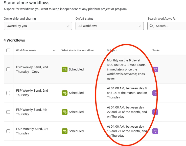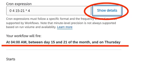 I have stand alone workflows set up with custom cron expressions that are not working as anticipated and as appearing to be programmed correctly - per Qualtrics support “The entire statement can't be treated as an AND statement. This means that it was checking for if the day was 15th-21st or if the day was a Thursday. They confirmed that, it looks like there isn't a way to set up a Cron expression that specifically sends on the first, second, or third Thursday of a month.” This is very frustrating and there is nothing on the Qualtrics side stating this is not possible and there was an error in the expression.