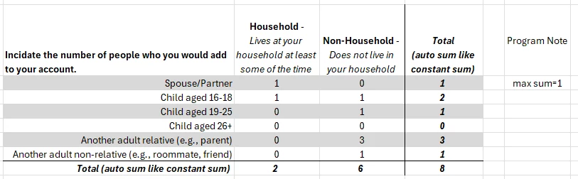 Essentially, I want to create the table below as a question. A constant sum with two columns--preferably with columns AND rows summed if possible.