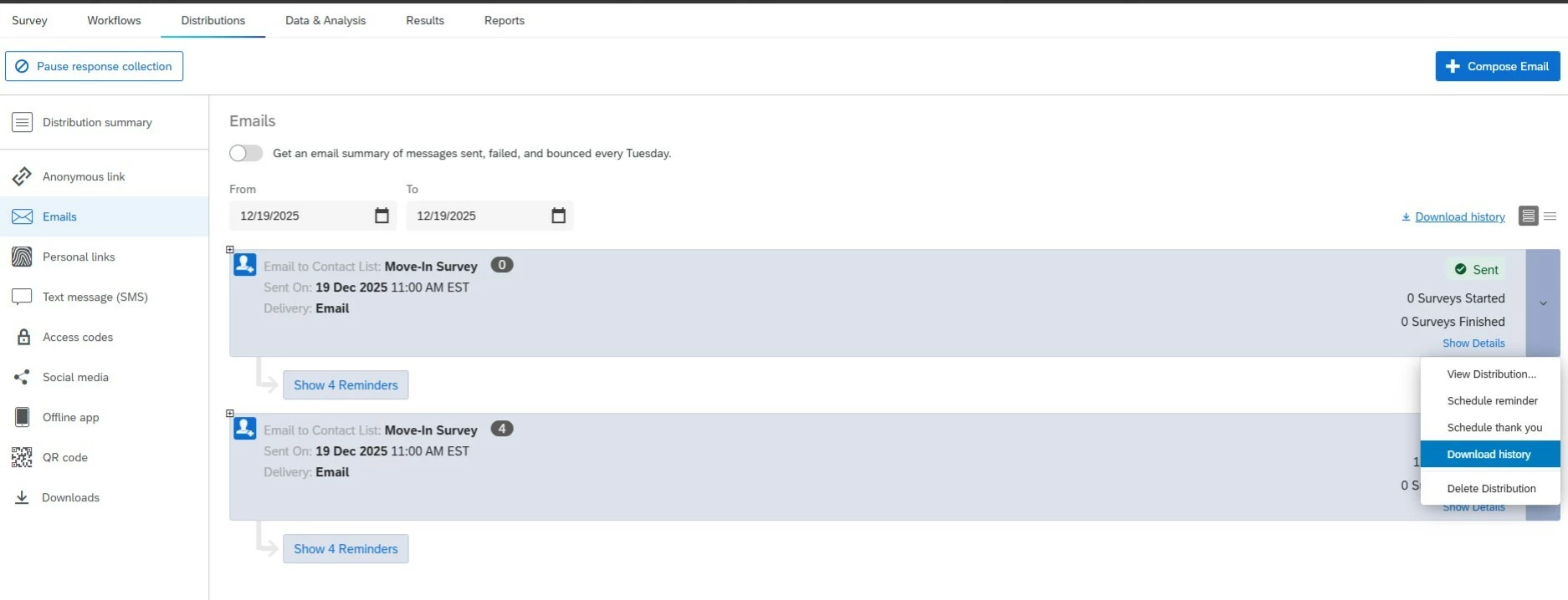 Is there a faster way to check if a survey has been sent to a customer email? Currently going to Email distribution to pick a date range and needing to export each date file to search for an email.