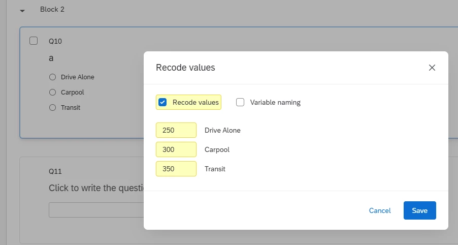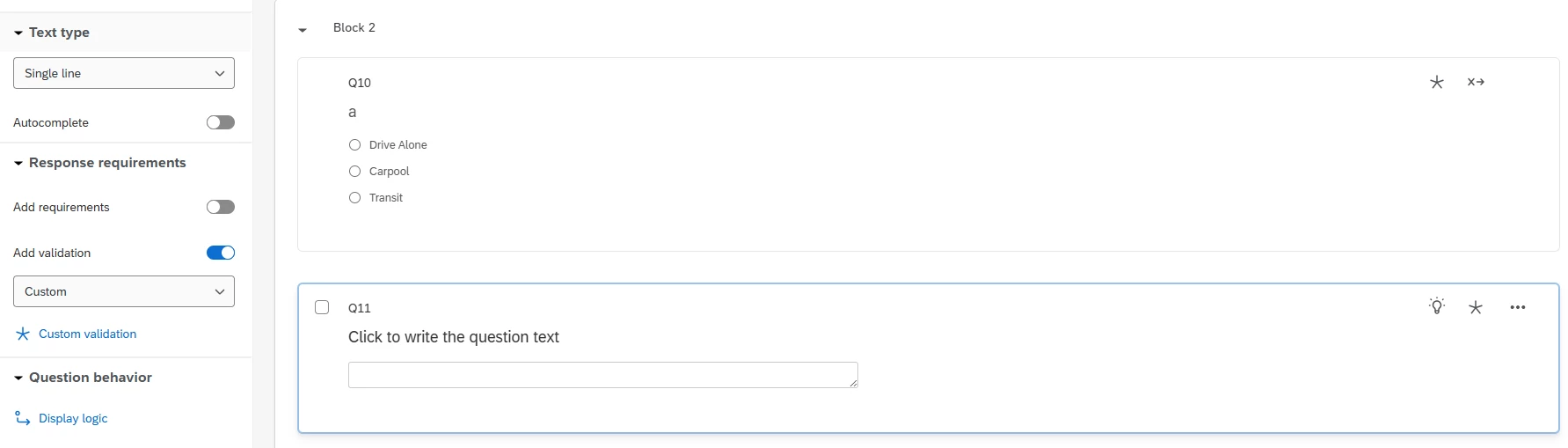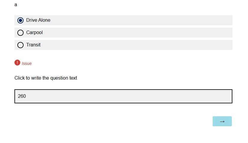 I need the numeric entry to be capped at the selected mode’s cost (e.g., if Drive Alone costs 250 points, the input must be ≤ 250). The mode’s cost is stored in an embedded data field S1D1_CostPoints, but I realized embedded data doesn’t update until the page submits, so standard validation can’t read it on the same page.