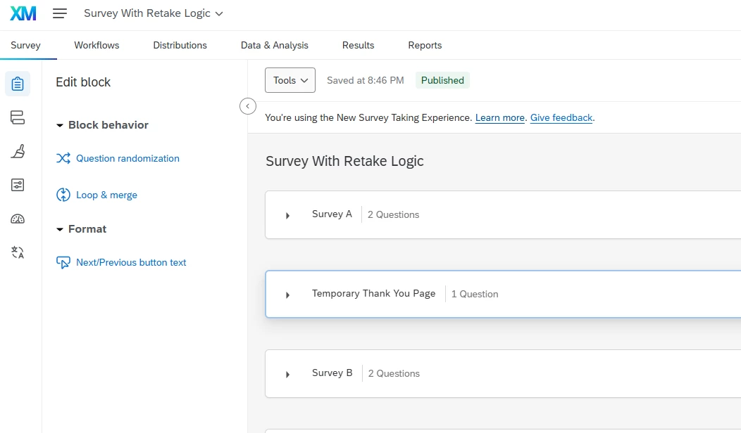 Because the response stays in-progress, your distribution reminder emails will keep firing on whatever schedule you set. Each reminder link resumes the same session and lands the respondent directly on Survey B. Once they complete it, the response is submitted and reminders stop.