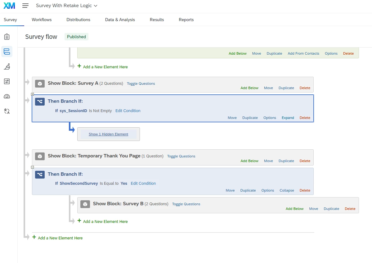 - On the return visit, the session resumes after the Temporary Thank You Page, so `ShowSecondSurvey = Yes` is already set and Survey B is shown directly