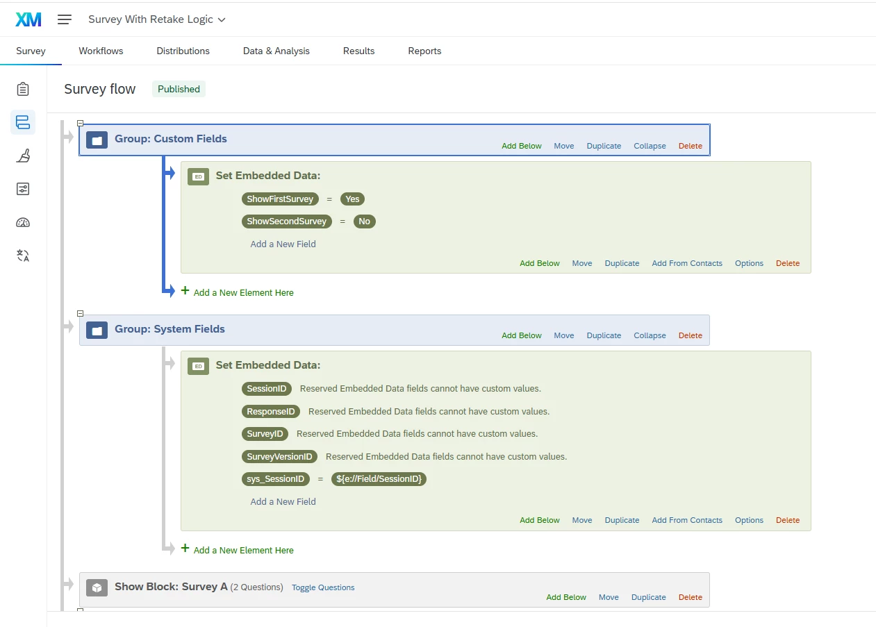 - Body: `{ "advance": true, "embeddedData": { "ShowSecondSurvey": "Yes" } }`