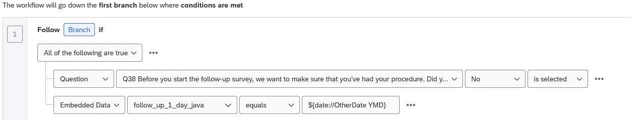 I have a follow-up survey and it’s first two questions are date dependent. first question is have you had your procedure yet. if the participants responds “no” they are asked to put in their new procedure data. this in turn triggers a workflow within the follow-up survey to send the same survey to the participant a day after their procedure. if they click no again and input a new date, this workflow repeats until they’ve had their procedure.