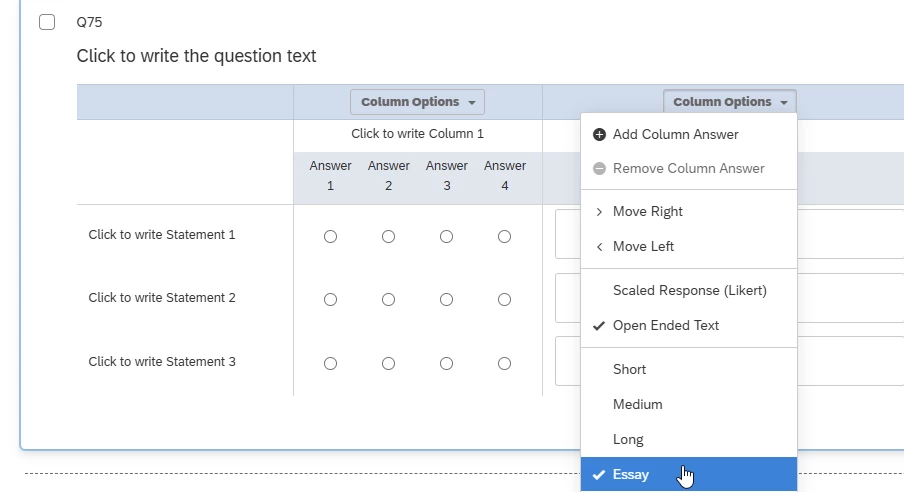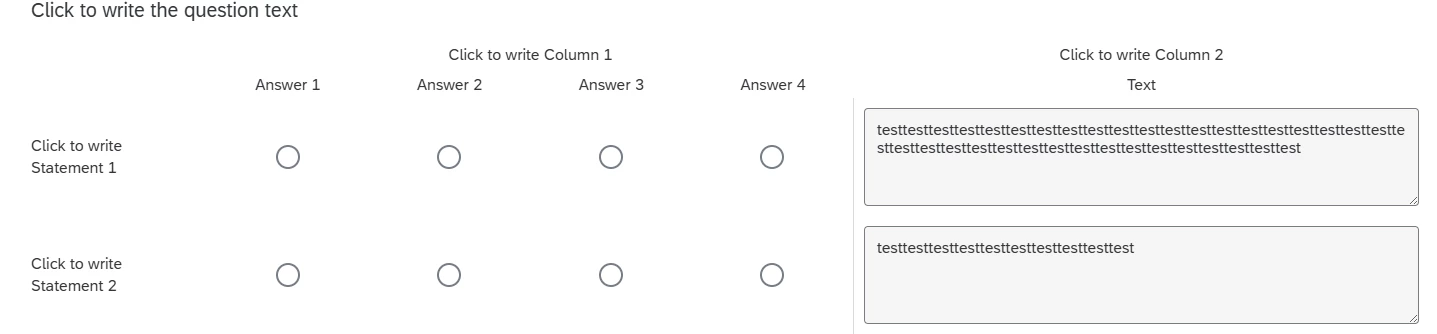 I have a side-by-side question, with in the first columns a 4-bullet-point question, and in the last column an open text field.