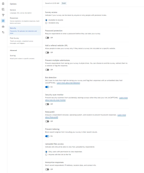 I am testing the survey with share preview link and public option selected so that link can be easily accessed by the test subject.