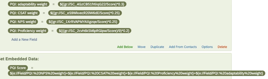 I have a survey with scoring where questions will be weighted differently for their final score. Typically I can weight and do calculations/custom metrics within a dashboard - except for this project I must have the weight calculations completed and have it hit the data & analysis within the survey as I export the data to be used in a 3rd party reporting/dashboard platform.