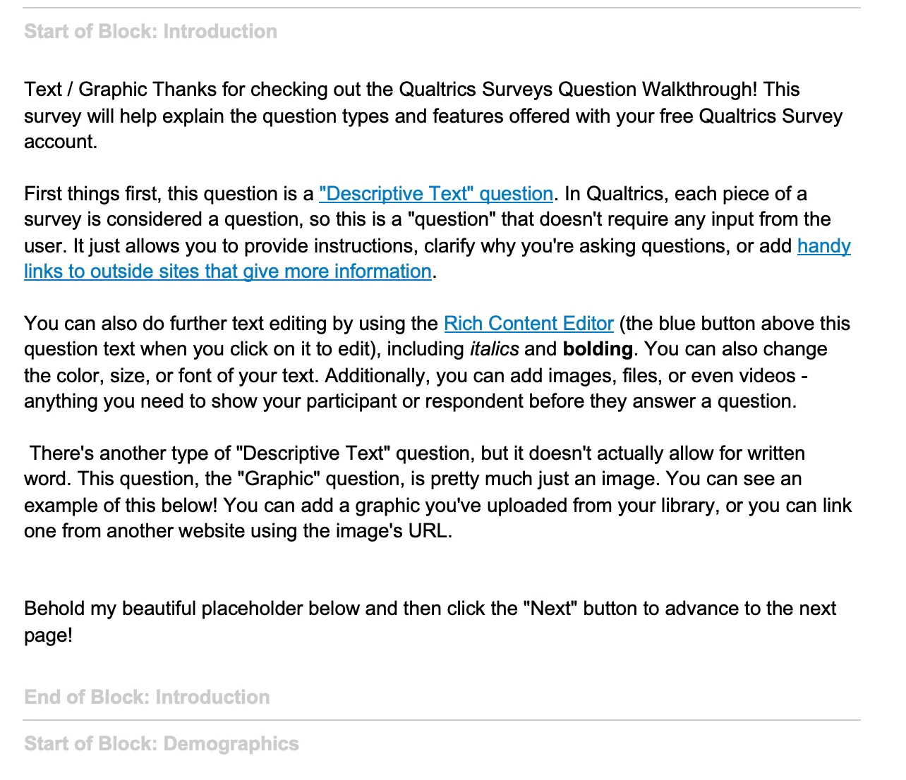 I am trying to export a survey to a word doc, but it looks completely different. The word document does not show half of the items I put in, instead showing generic blocks (e.g. “Text / Graphic Thanks for checking out the Qualtrics Surveys Question Walkthrough! “). It only does this for the word export. The pdf export looks perfectly normal. 😕