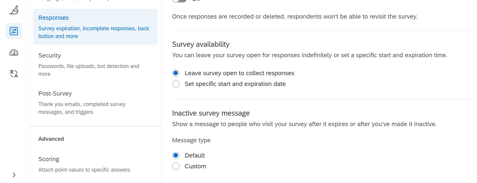 Can you also check that in your survey settings you don’t have a custom inactive message?
