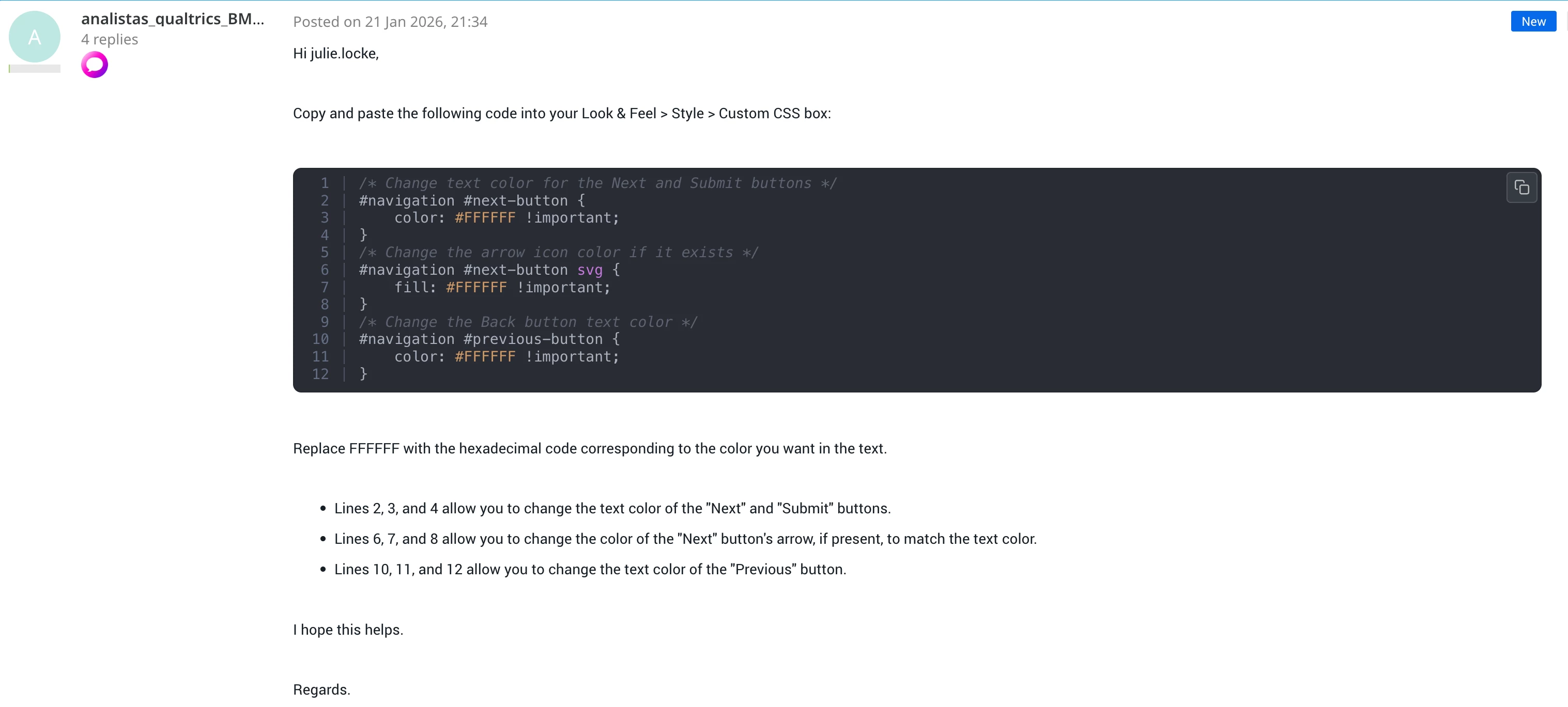 Submit Button Customization: Learn how to change the text color on your submit button in the New Survey Taking Experience using custom CSS solutions.