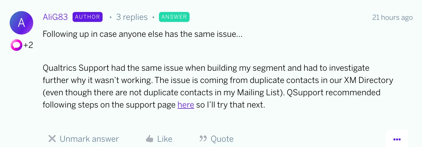 Mailing List Segmentation Issues: Fix segments that aren't properly excluding members who've already completed surveys. Qualtrics Support identified duplicate contacts in XM Directory as a common cause, learn deduplication steps to resolve this.