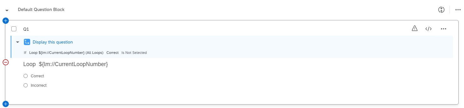 When Loop & Merge is enabled on the block, Qualtrics repeats the block internally. Even if the respondent answers correctly on iteration 1, Q1 is still presented again on iterations 2 and 3.